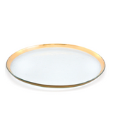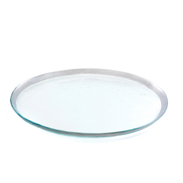 The Roman Antique Round Party Platter features hand painted edges. This oversized glass tray can be used as a tray for drinks, wedding cake server, or loaded with appetizers for cocktail hour.