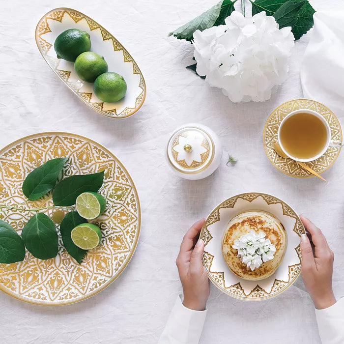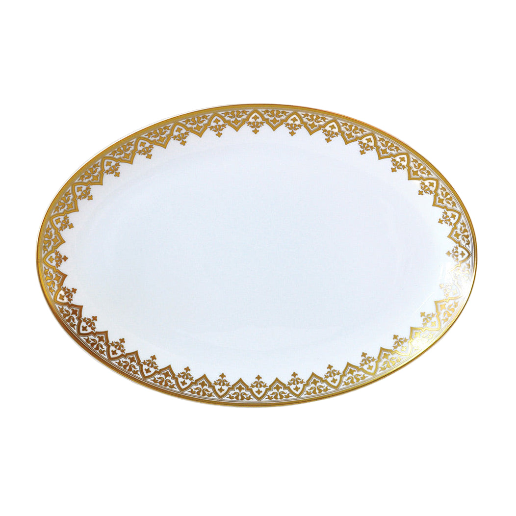 Venice's magnificent architecture and brocade textiles inform this stunning Bernardaud pattern. Wide 24K gold bands of pattern lend lavish detail to fine white porcelain. To present and serve roasts and grilled fish.