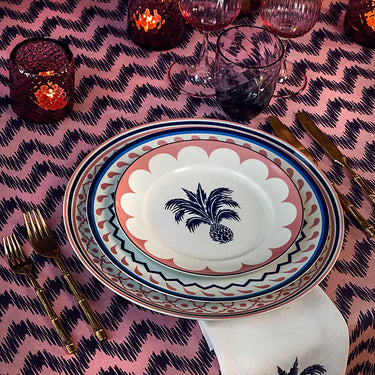 Aquazzura's Jaipur collection was created through a love of travel, pattern, geometry, and adventure. The floral motifs are inspired by ancient temple drawings, paired with chevrons and stripes for a contemporary layered tabletop twist. Jaipur evokes the scents and atmospheres of a journey to India, one of Edgardo Osorio's most-loved destinations. This striking charger plate is crafted from the finest porcelain with an eye-catching design in the center and a vibrant pattern encircling the border.