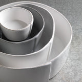 The Lastra White Large Serving Bowl features rustic, sculptural edges, and an overlapping wooden mold, used for centuries to form cheeses throughout Italy, inspired this collection.