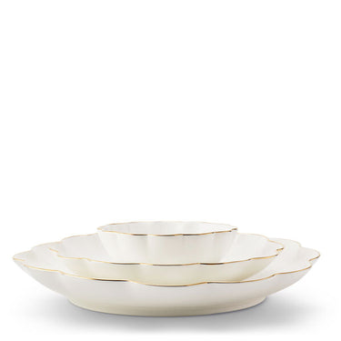 A set of three dishes—one bowl and two sizes of plate—with an elegant scalloped edge that has been further enhanced with a hand-painted gold trim. This versatile set can be used separately as serving dishes, or pair the bowl with either of the plates as a dipping option.