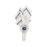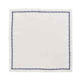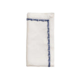 A fresh take on the classic, crisp white linen napkin, the linen Filament Napkin features long, floating embroidered stitching. These long stitches are reminiscent of the filaments in the center of a lightbulb. The deep blue stitches contrast against the white linen napkin similarly to the way the bright light contrasts against the frosted glass.