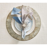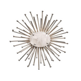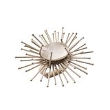 The handmade Flare Napkin Ring is a metallic burst of energy. Each spoke of this silver napkin ring is meticulously welded and bent to create the unique shape. The silver napkin ring features hand-applied metallic paint and quartz and malachite replica center stones. Add a pop of zest to any table with this gold napkin ring.