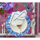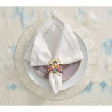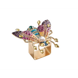The decorative Glam Fly Napkin ring features elaborate hand-enameled details in vibrant colors. Encrusted with rhinestones and pearls, the fantastical gold napkin ring depicts a mythical insect. The elaborate cast metal napkin ring is the perfect accessory for a lively soiree.