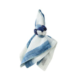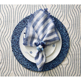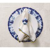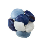 The Sea Stone Napkin Ring in navy features shades of blue resin stones set in clusters. These sea-inspired napkin rings are reminiscent of tumbled stones found upon the shore. Arranged at random, the stones are mounted on a beautifully beaded ring. These nautical napkin rings are the perfect addition to a bright and cheery table.