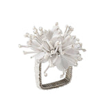 The beaded Starburst Napkin Ring features hand-attached white glass beads fashioned into a vibrant burst. Inspired by the brilliant point of light emitted by the burst of a supernova, the glistening metallic white beaded napkin ring will add a spark to any table. These stunning napkin rings are versatile enough to use throughout the year on any elegant tablescape.