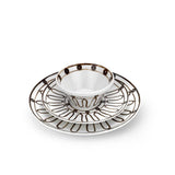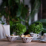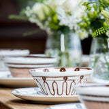 Handcrafted bowl in fine porcelain adorned with hand-painted Kyma pattern in brown.