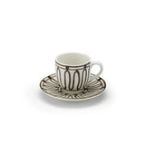 Handcrafted espresso cup & saucer in fine porcelain adorned with hand-painted Kyma pattern in brown.