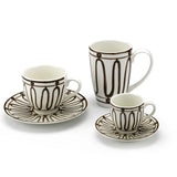 Handcrafted mug in fine porcelain adorned with hand-painted Kyma pattern in brown.