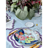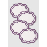 Oval linen placemat with appliqué in white and purple, and with an embroidered scalloped trim.