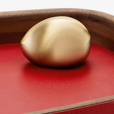 The Pebble Accessory Tray combines red pebbled leather with walnut edges for a warm, elegant look. Its magnetic brass piece keeps small items organized, while rounded corners add a stylish touch to any room.