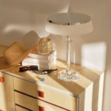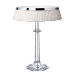 The Baccarat Bon Jour Versailles lamp sits on top of a finely sculpted transparent crystal stand whose lines are reminiscent of the Maison Baccarat most iconic pieces. Crowned with a chrome plate, the lamp features a unique and innovative LED Edge Lighting technology developed by Flos. This, coupled with a tailored lampshade in pleated fabric, allows the diffusion of warm light that reveals a reflection of magical transparency.