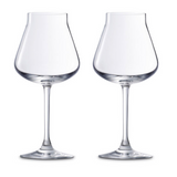 Inspired by the taste-vin silhouette that sommeliers use, the wide rounded bowl opens up complex notes, aerates the wine and highlights the subtle and smooth aromatic body. The tapered lip enables the diffusion of aromatic richness and prevents the wine, when swirled, from rising too high up along the glass.