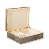 Tasteful and refined, this jewelry box in rich, delicately embossed shagreen and brass trim creates a pretty storage space. The large size is endlessly versatile, whether placed on a vanity to hold favorite accessories or set upon an office desk to store odds and ends.