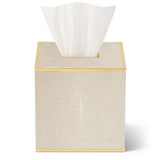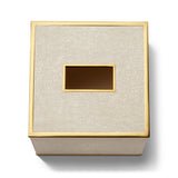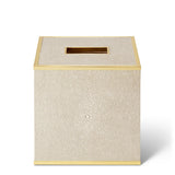 Create a clean look and organize a vanity or bathroom with this shagreen tissue box. The cover has an elegant look, edged with brass, with a suede lining.