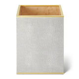 Create a clean look and organize a vanity or bathroom with this shagreen waste basket. The shagreen basket has an elegant look, edged with brass, with a suede lining.