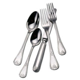 Stainless steel. Five-Piece Place Setting includes table fork, table knife, medium teaspoon, dessert spoon and dessert fork.