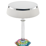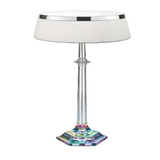 Flooded with light, the Bon Jour Versailles dichroic lamp changes color depending on the angle of view and the illumination. Crowned with a chrome top, this creation incorporates a unique and innovative Edge Lighting LED technology, developed by Flos. This revolutionary system, combined with an elegant lampshade, allows the diffusion of an organic and warm light which reveals the spaces thanks to the play of infinite reflections.