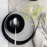 This stunning Rosenthal dinnerware is called Junto. It is produced using the finest porcelain creating a style that is best described as natural and handcrafted. The dinner plate measures 10 5/8 x 10 1/4 inch. The most prominent color of this item is white. This piece is decorated with a most beautiful relief and makes you 'feel the difference'.