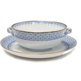 The Lace cream soup in cornflower blue features handles and an underplate.