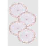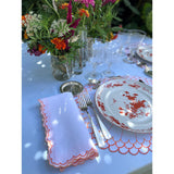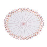 Escamas placemat is made into an oval design bordered with a two-tone embroidered scalloped trim.