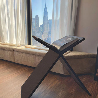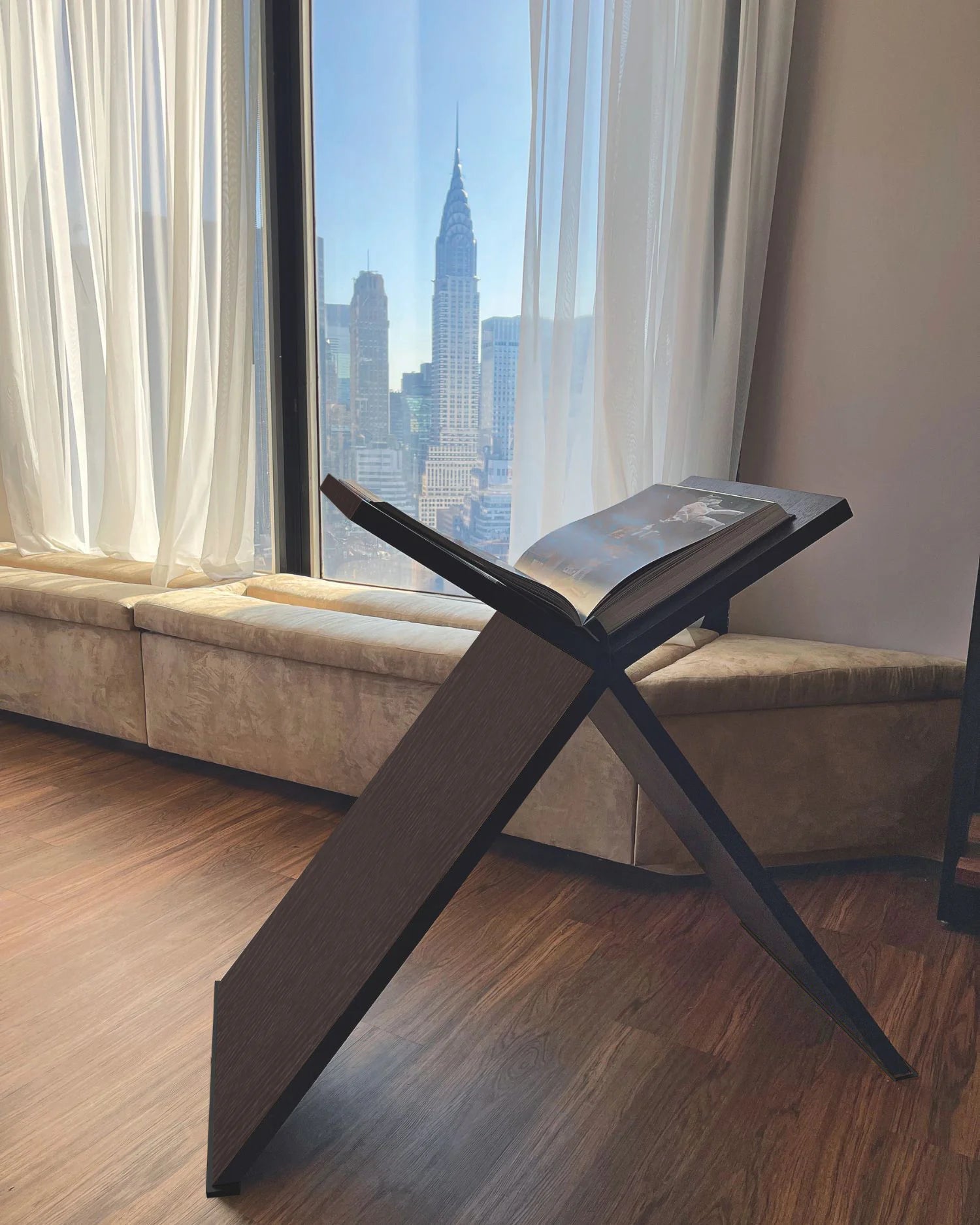 The Allure Bookstand was originally designed by Prosper Assouline to showcase the one-of-a-kind handmade titles of the Ultimate Collection. Available in dark oak with a metal base in a brass finish, this elegant piece stands tall at 40 inches. More than a bookstand, this work of art is sure to be the centerpiece in a modern room or library, alluring viewers to the delicate pages of any tome.