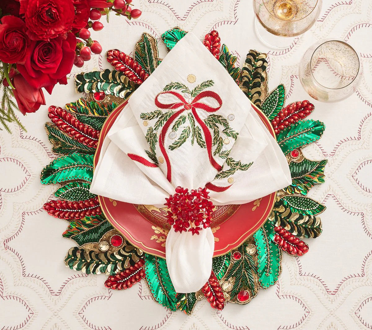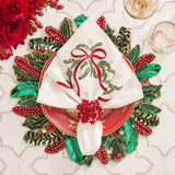 The beaded Aster Napkin Ring is a true showstopper. Featuring a burst of red glass, disc-shaped beads that sparkle in the light, this stunning napkin ring adds a touch of glamor to your table decor. Hand-arranged atop a square lucite ring, its versatility allows it to enhance a lavish table or add sparkle to a more subtle setting, making it a versatile and elegant accessory for any dining experience.