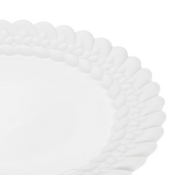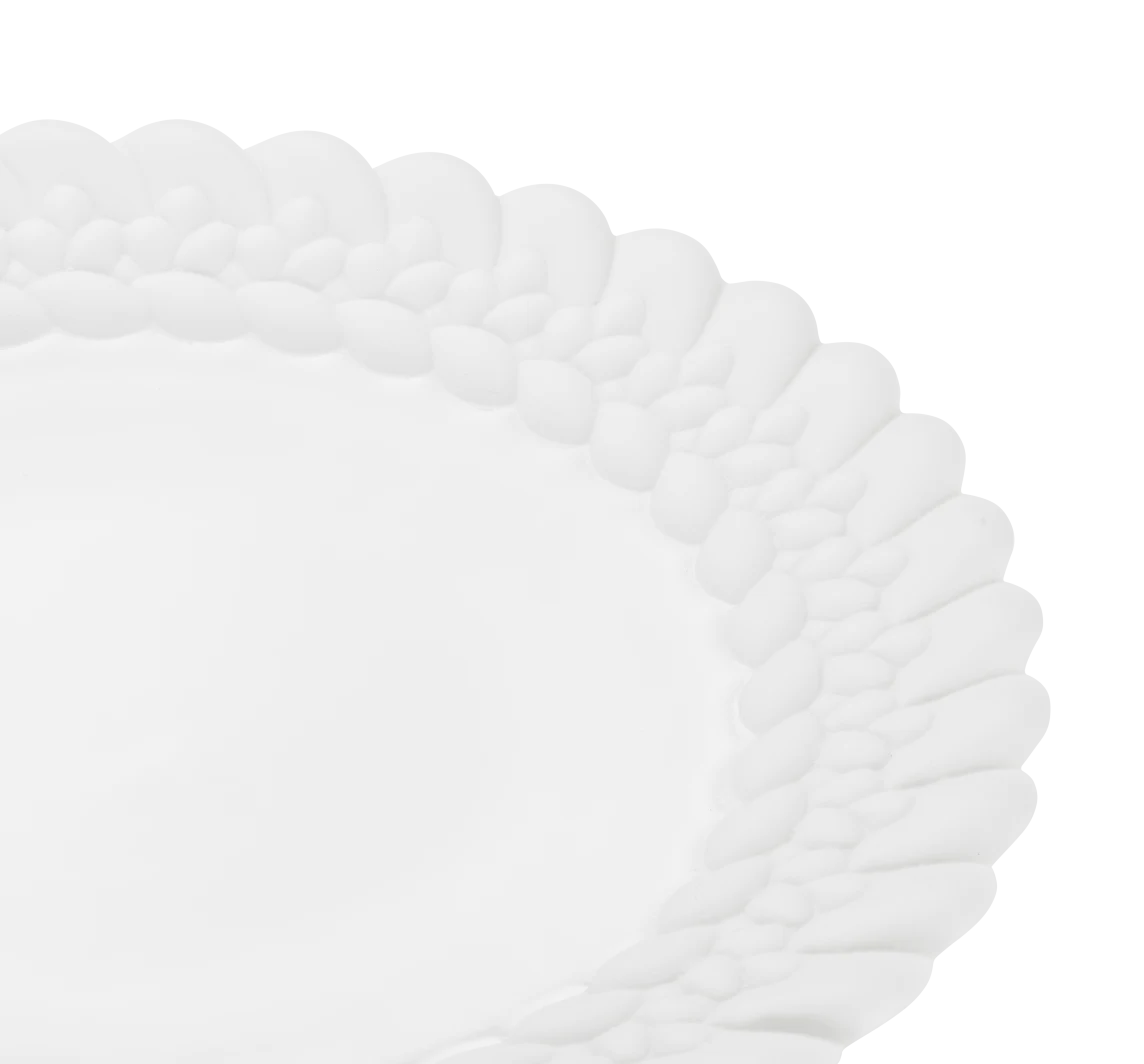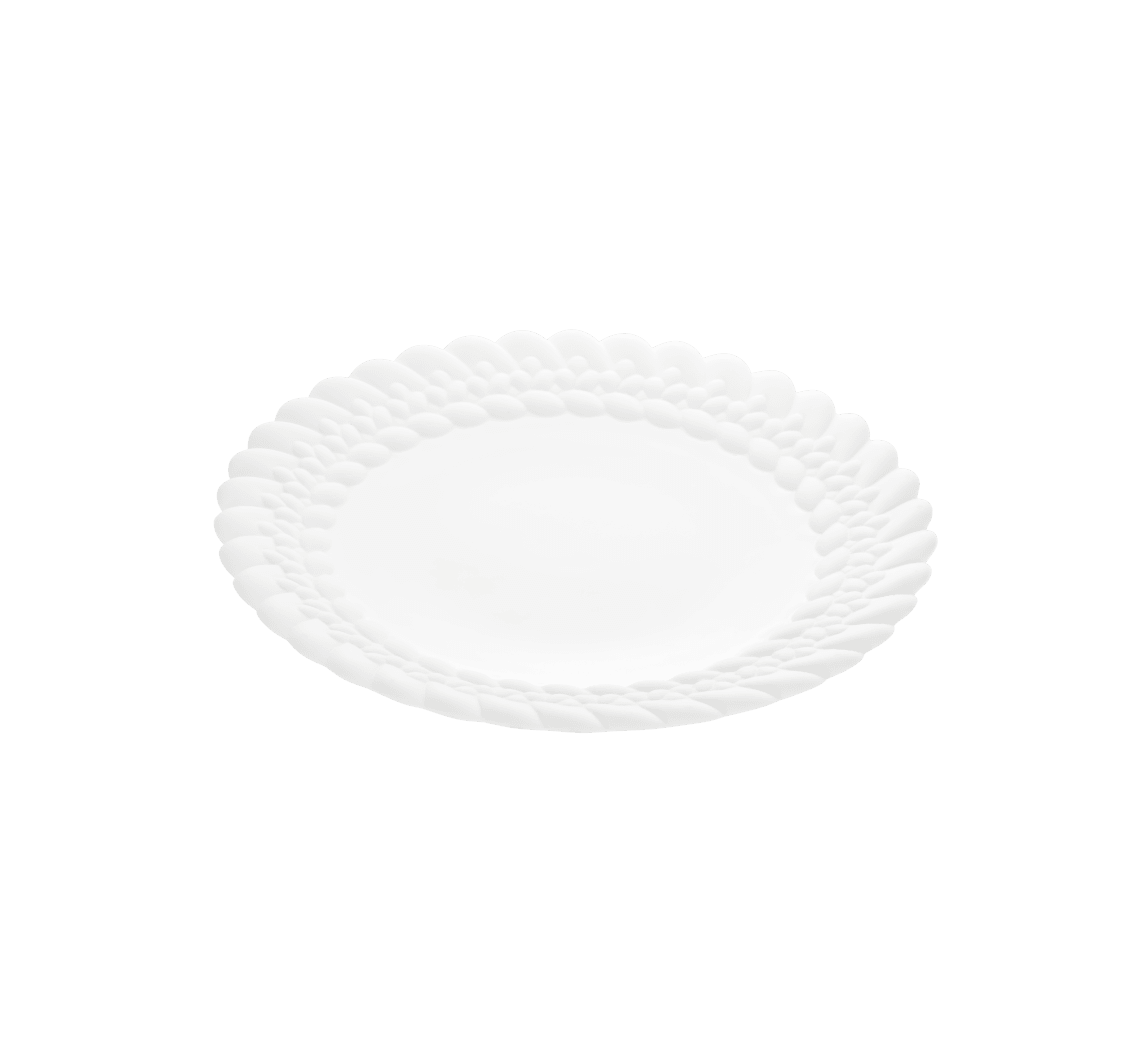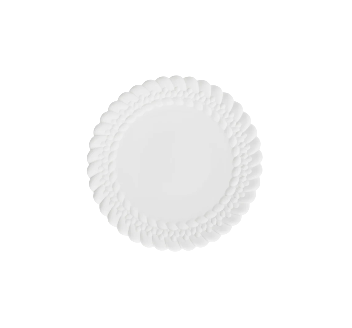 White porcelain bread plate delicately surrounded by the Babylone braided pattern in matte porcelain for a soft play of contrast. Completely hand-crafted in France, its finesse, density and transparency are the hallmarks of exceptional porcelain.