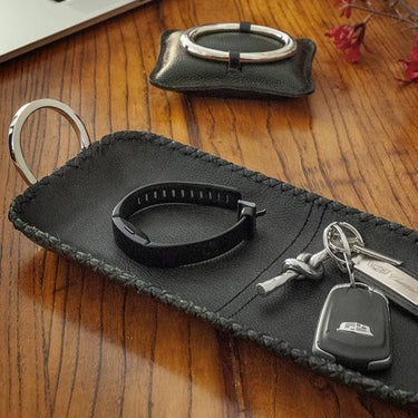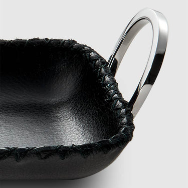 The Durango Black Leather Rectangle Tray keeps your essentials organized and within reach. Use it to corral wallet, phone, and keys on your nightstand, desk, or entryway table. Handcrafted from pebble-textured leather with sturdy metal ring handles, this tray combines rustic charm with everyday functionality. Its simple, elegant design complements any décor while serving as both a practical organizer and a stylish accent piece.
