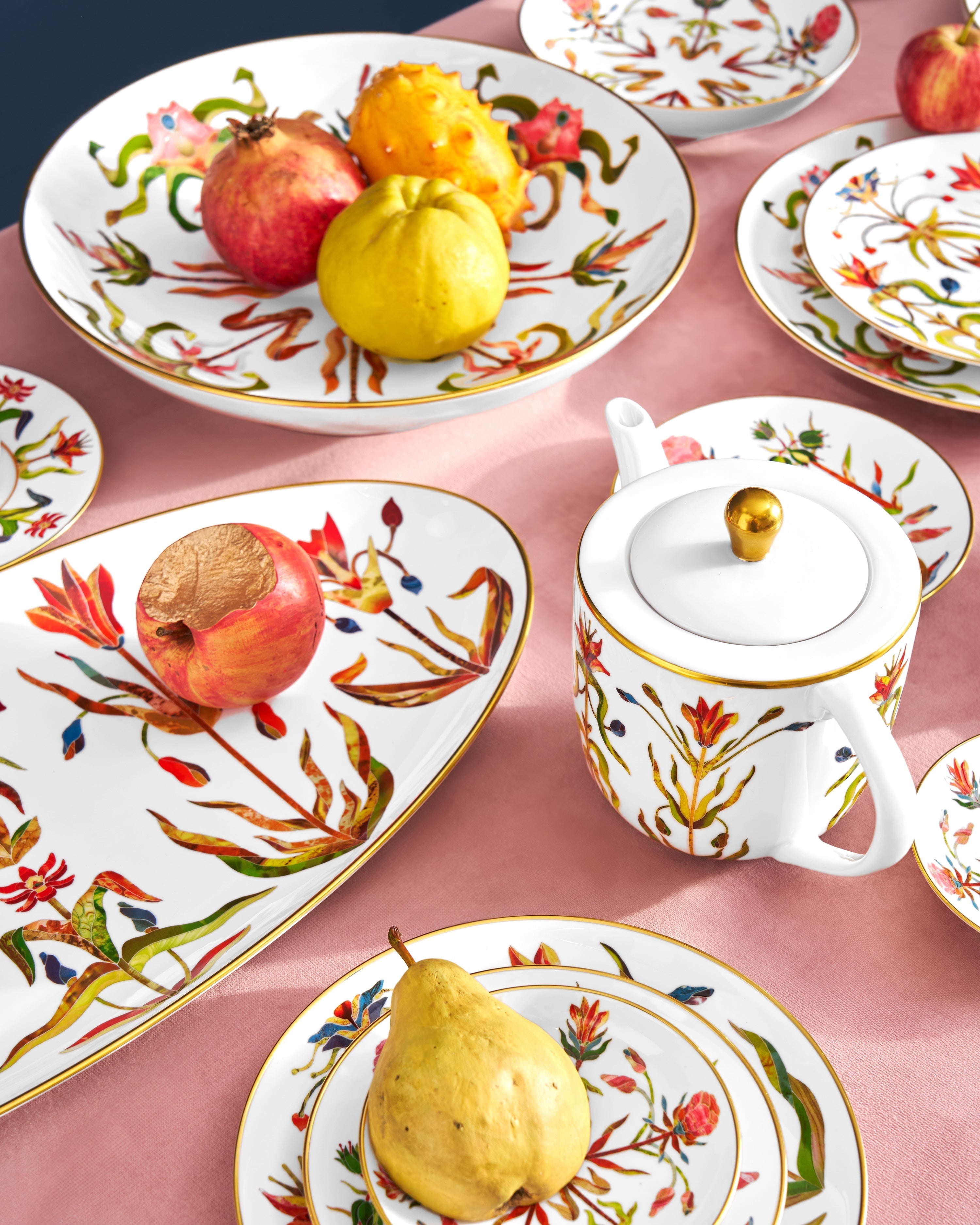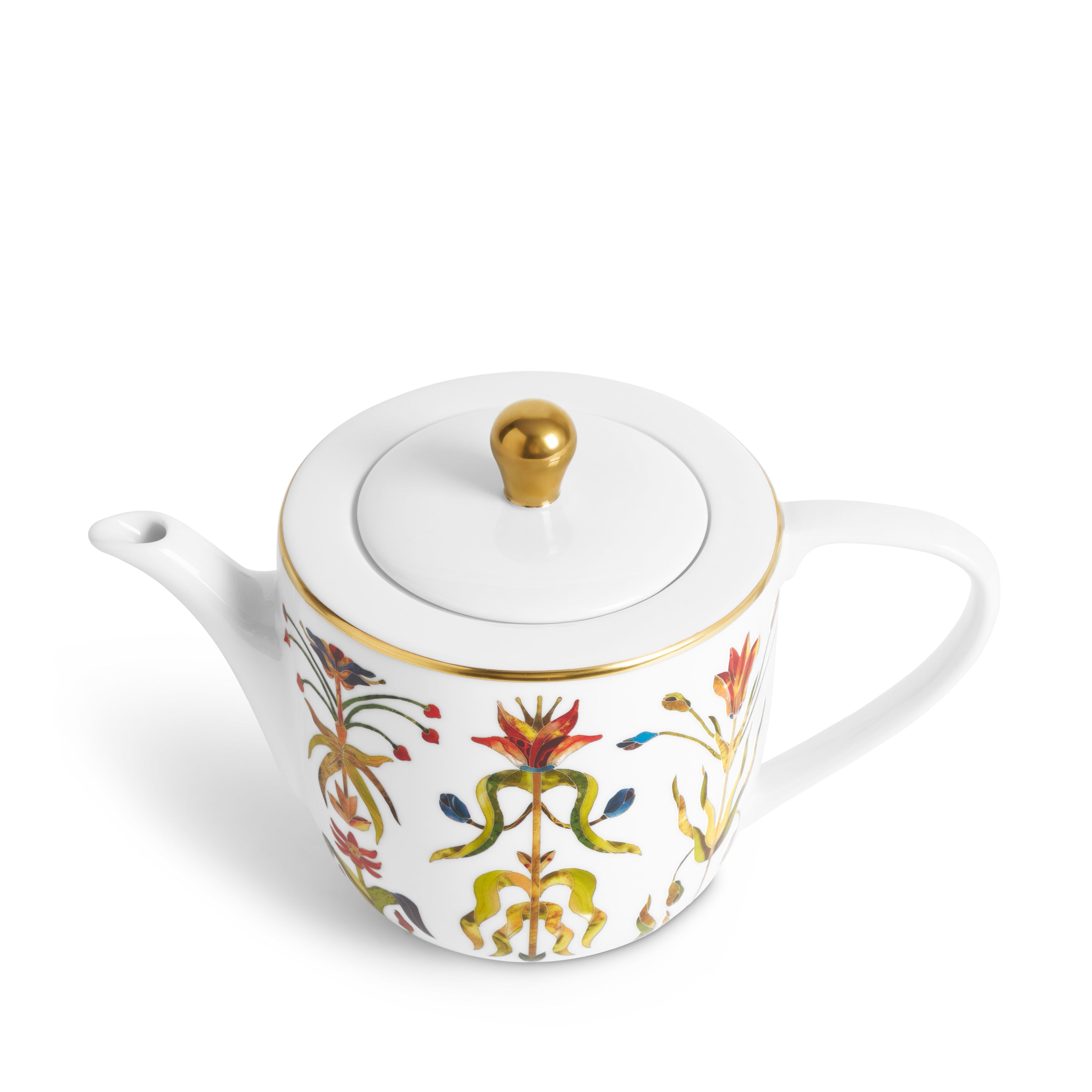 A graceful teapot that evokes the refined rituals of European salons. The porcelain body is adorned with botanical illustrations inspired by stone inlay, layered with color to achieve depth and luminosity. Hand-applied gold enhances the silhouette, creating a piece that echoes the artistry and collected treasures of the Grand Tour tradition.