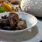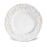 Porcelain charger featuring an intricate and organic pattern reminiscent of desert pebbles and of the endless stars in the desert sky. Available in an impactful wide rim design and a subtler regular-width rim design to provide versatility.