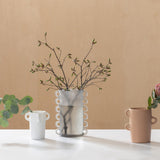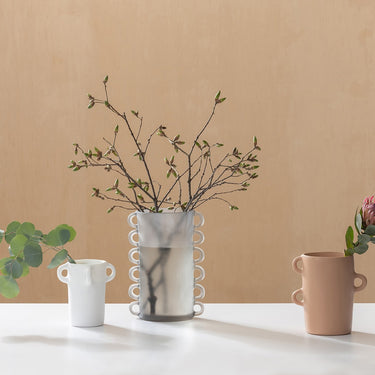 The Loopy Medium Vase features loops reminiscent of handles or a strip of exaggerated lace along the outside. The wabi-sabi imperfections in each loop capture the eye, and compliments any flower arrangement.