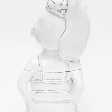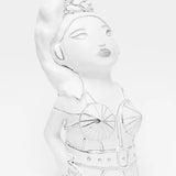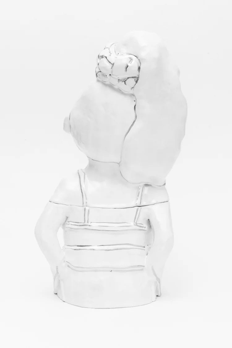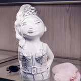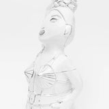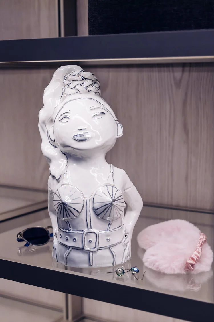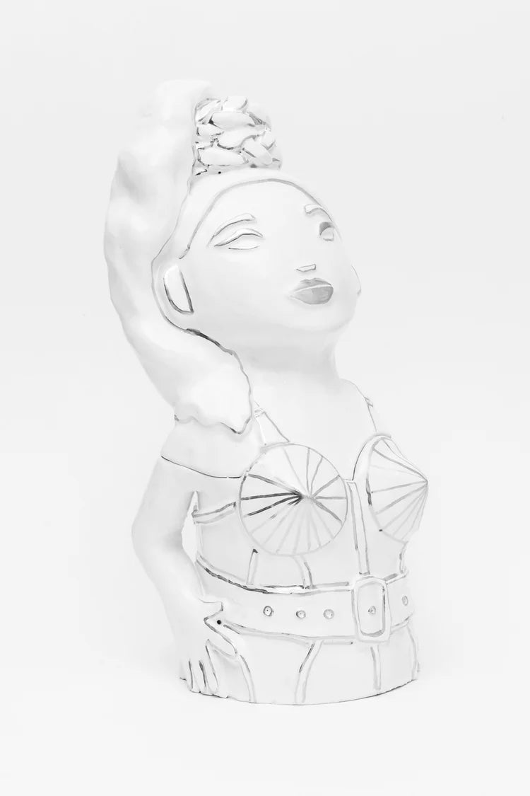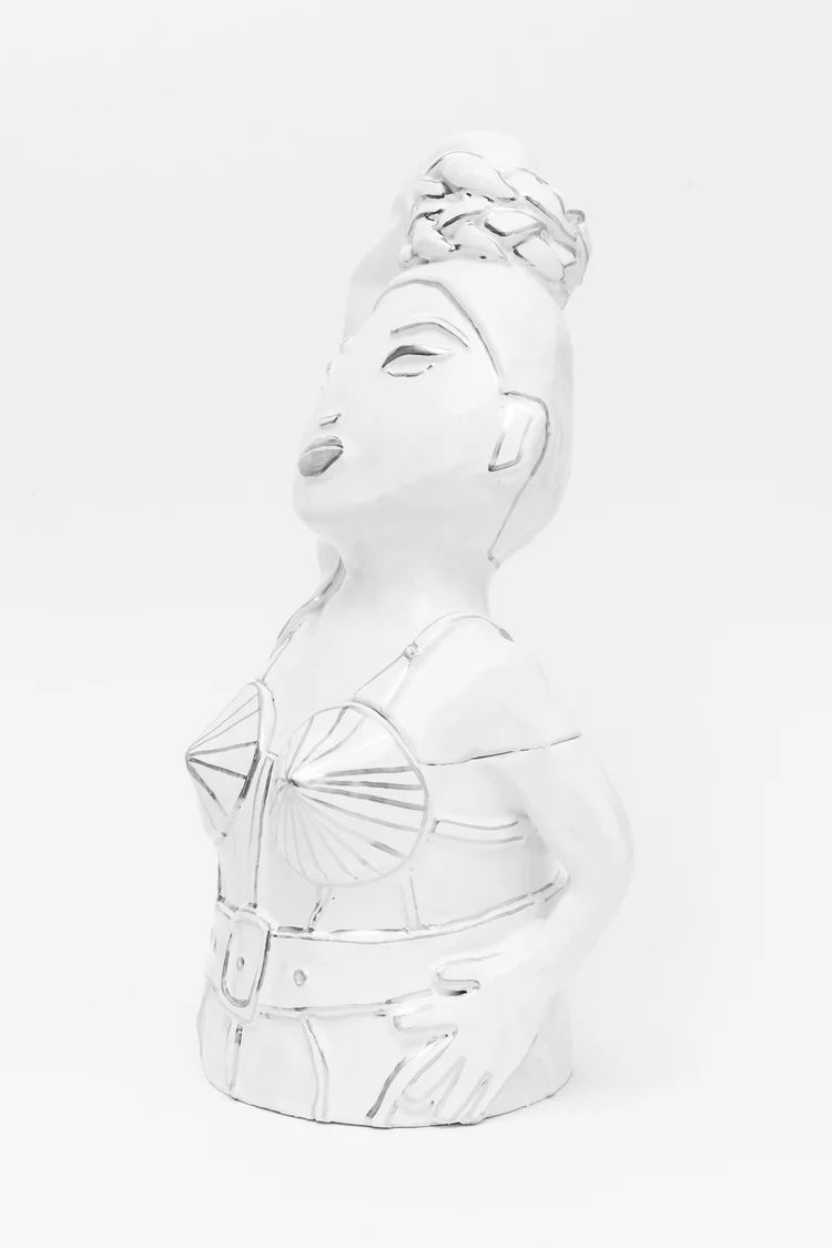 The Madonna Cookie Jar is a lidded jar, hand-sculpted out of ceramic clay by Hazy Mae. Glazed bright white with shiny metallic chrome details. It's the perfect place to store your yummiest cookies, sweetest candy, or even your most cherished concert tickets!