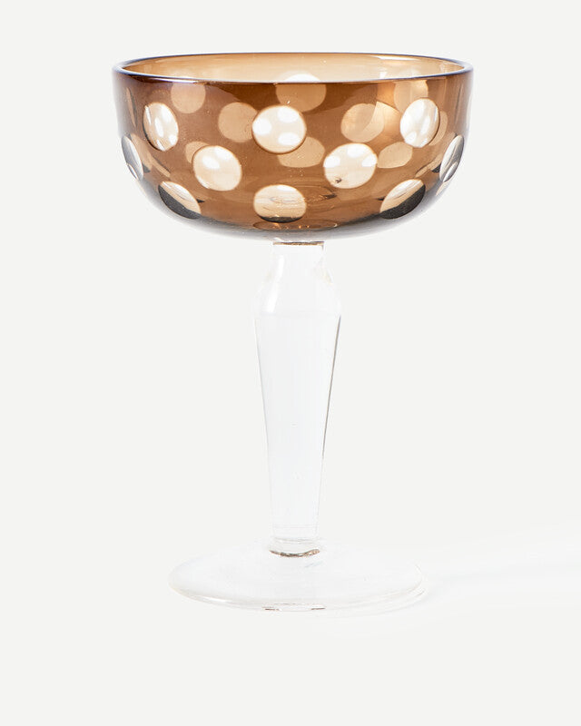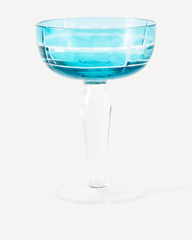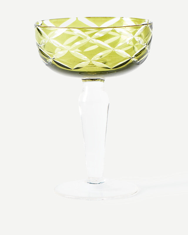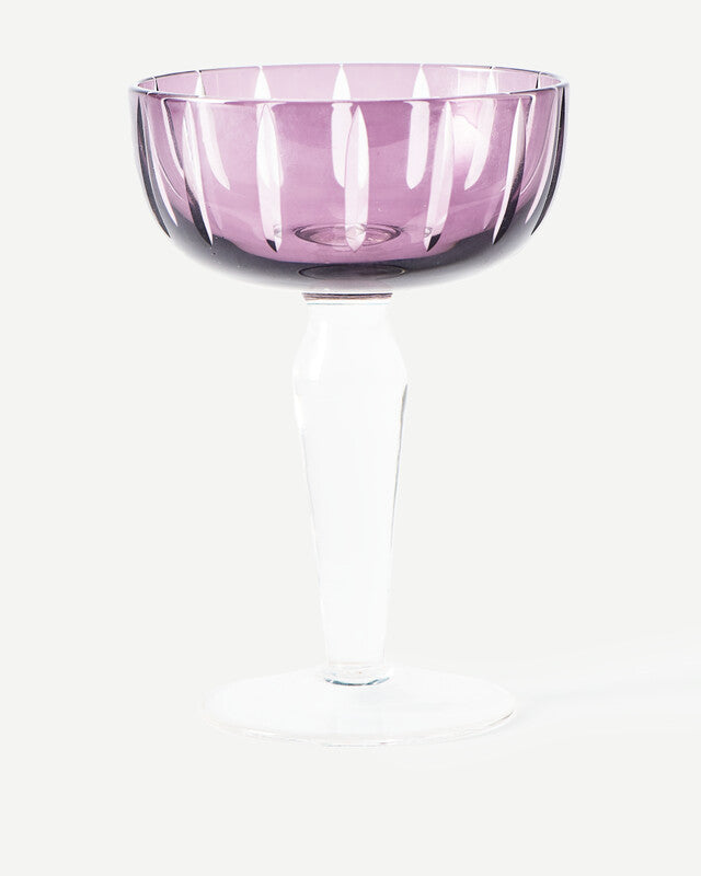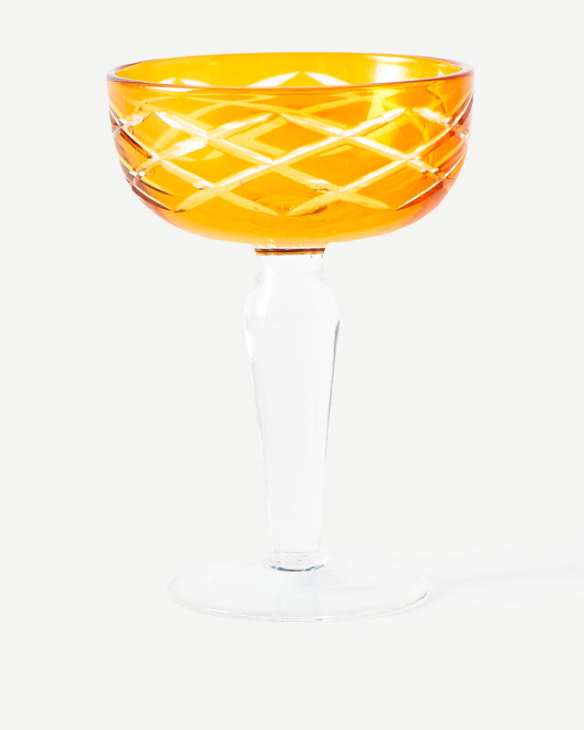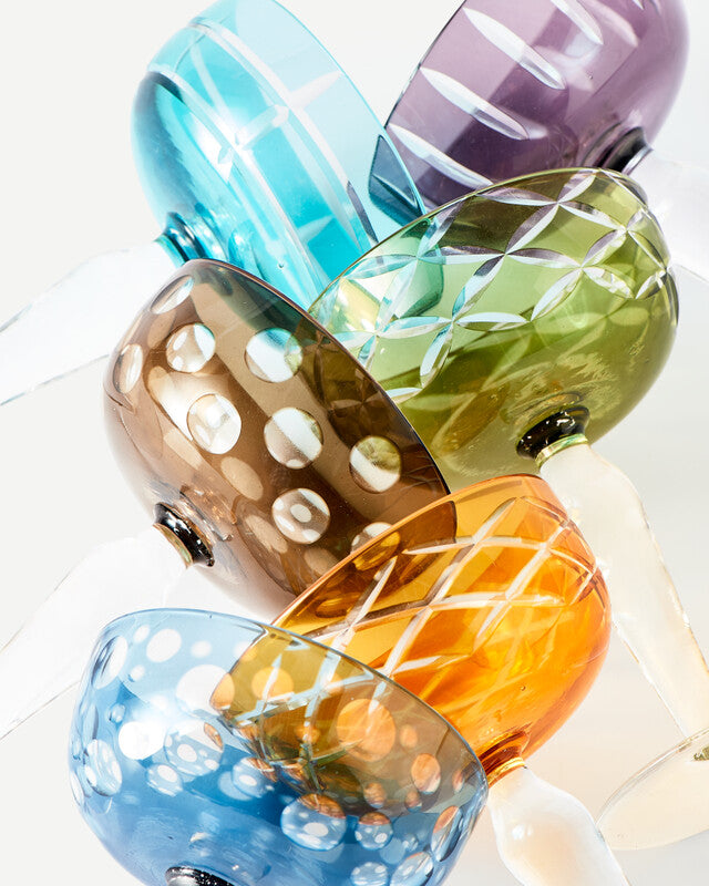 Polspotten's Multicolor Cuttings Coupe Glasses are made from full colored glass and each has its own unique ‘cutting’ pattern. Perfect for weddings, events, or entertaining guests.