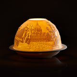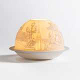 It was in Limoges, France, in 1828 that Paul de Bourgoing invented the Lithophane (VotivelightTM), a traditional engraving technique on a fine bisque (non-glazed) porcelain. The glow of the candle shines through the raised and carved surface of the votive contrasting light against shadow, revealing its richly detailed design.