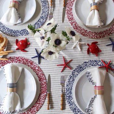 These eye-catching placemats stand out thanks to the chic sparkle of colorful beads mixed with white. The strong silhouette and festive look make them a versatile statement piece that instantly dresses up a table. Available in red, black, bronze, & navy.