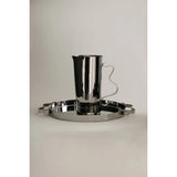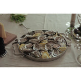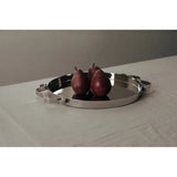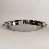 A mirror polished stainless steel serving tray, with two soft, wavy, ribbon-like handles. This tray is ideal for serving drinks or appetizers, coffee or tea, or simply as a decorative catch all.