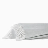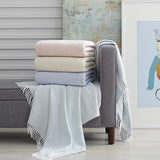 Terzo throws feature a classic basket weave pattern in soft, versatile colors that are welcoming in any room. Graceful and elegant, it is crafted from pure cotton and the pillows are filled with feather and down.